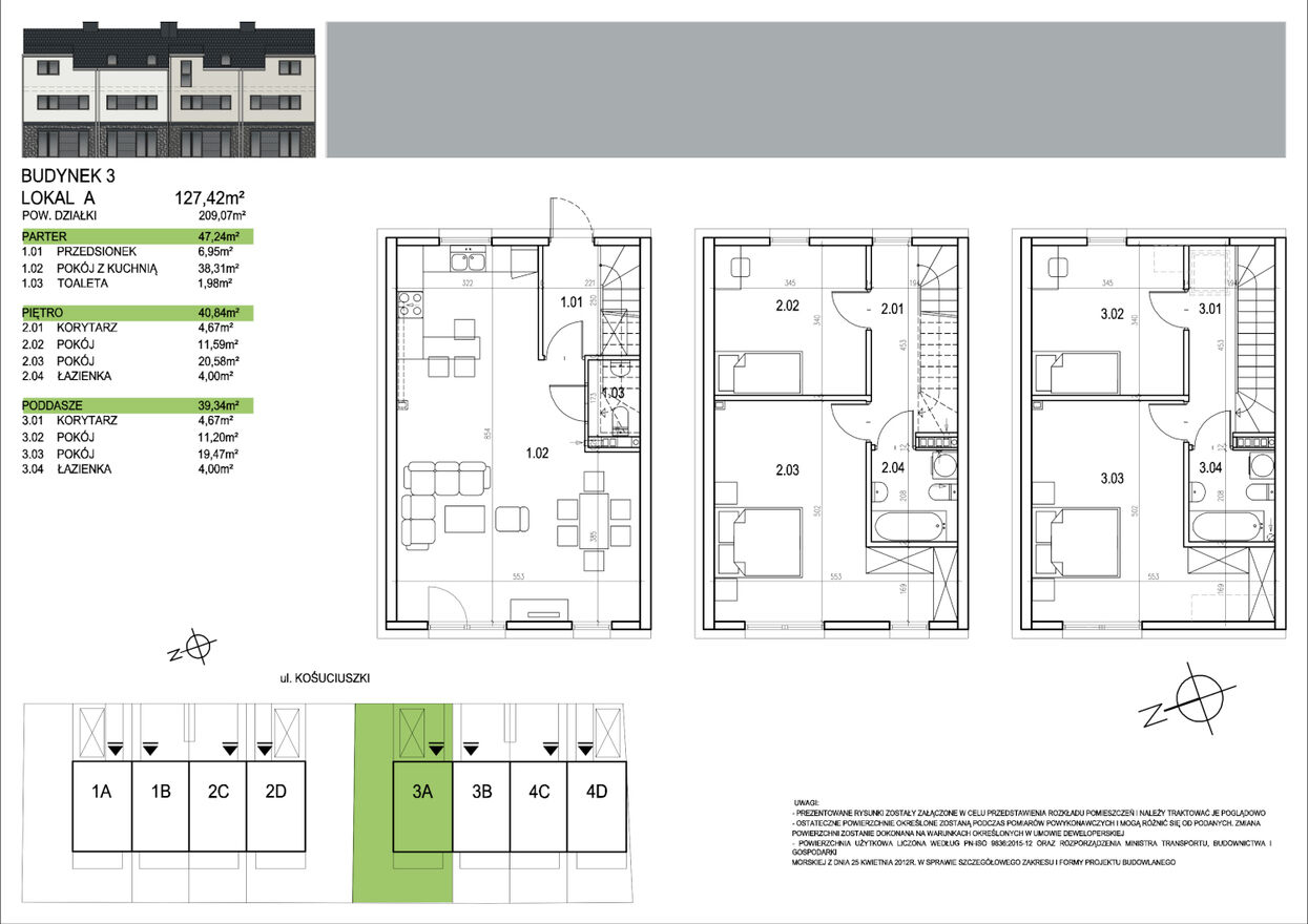 Zapraszam do zakupu pięknych domów w zabudowie szeregowej z ogrodami. Otoczenie malowniczych terenów zielonych jest niewątpliwym atutem tego miejsca, docenianym przez osoby chcące mieć za „sąsiadów” ciszę i spokój. Bliskość Wrocławia, a zarazem cisza i zieleń- sprawiają, że jest to odpowiednie miejsce zarówno dla rodzin z dziećmi jak i osób ceniących życie z dala od miejskiego zgiełku oraz okolicę z dużym potencjałem rozwoju. Komfort życia to lokalizacja, odpowiedni metraż, idealny rozkład sprawią, że pokochasz to miejsce.Prezentowane mieszkanie ma powierzchnię 127,89m2 a jego główne cechy to-na parterze -duży przestronny salon z aneksem kuchennym o powierzchni 39,35m2 z wyjściem na ogród o powierzchni 180m2. Na parterze znajduje się również toaleta o powierzchni 2,01m oraz przedsionek o powierzchni 2,54m2. Na piętrze znajdują się dwie sypialnie o powierzchniach 17,97m2 i 11,31m2 oraz łazienka o powierzchni 5,83m2. Na poddaszu zaplanowano dwie sypialnie o powierzchniach 14,69m2, 9,79m2 oraz łazienkę o powierzchni 5,83m2.