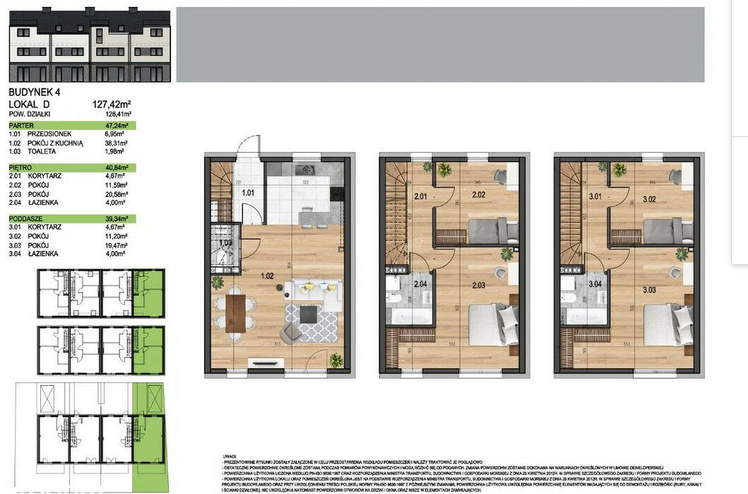 Zapraszam do zakupu pięknych domów w zabudowie szeregowej z ogrodami. Otoczenie malowniczych terenów zielonych jest niewątpliwym atutem tego miejsca, docenianym przez osoby chcące mieć za „sąsiadów” ciszę i spokój. Bliskość Wrocławia, a zarazem cisza i zieleń- sprawiają, że jest to odpowiednie miejsce zarówno dla rodzin z dziećmi jak i osób ceniących życie z dala od miejskiego zgiełku oraz okolicę z dużym potencjałem rozwoju. Komfort życia to lokalizacja, odpowiedni metraż, idealny rozkład sprawią, że pokochasz to miejsce.Prezentowany dom ma powierzchnię 127,42m2 - na parterze mamy duży przestronny salon z aneksem kuchennym o powierzchni 38,31m2 z wyjściem na ogród o powierzchni aż 180m2. Na parterze znajduje się również toaleta o powierzchni 1,98m oraz przedsionek o powierzchni 6,95m2. Na piętrze znajdują się dwie sypialnie o powierzchniach 20,58m2 i 11,59m2 oraz łazienka o powierzchni 4m2. Na poddaszu zaplanowano dwie sypialnie o powierzchniach 19,47m2, 11,20m2 oraz łazienkę o powierzchni 4m2.
