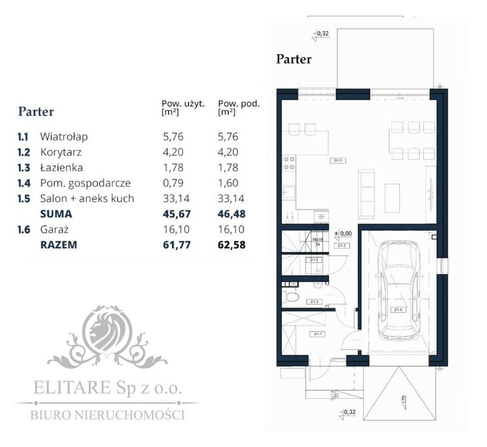 Strefa Dzienna to klasyczny układ otwartego salonu z jadalnią i kuchnią o pow. 33,14m2 z wyjściem na narożny ogród. Na tym poziomie znajduje się również toaleta o pow. 1,78m2 z miejscem na umywalkę, tuż przy wejściu mamy też spory wiatrołap z miejsce ma szafy w zabudowie, a w przestrzeni pod schodami znajdziemy spiżarnię z kotłownią o powierzchni 0,79m2, w bryle parteru jest również garaż o pow.16,14m2 z automatyczną bramą wjazdową.