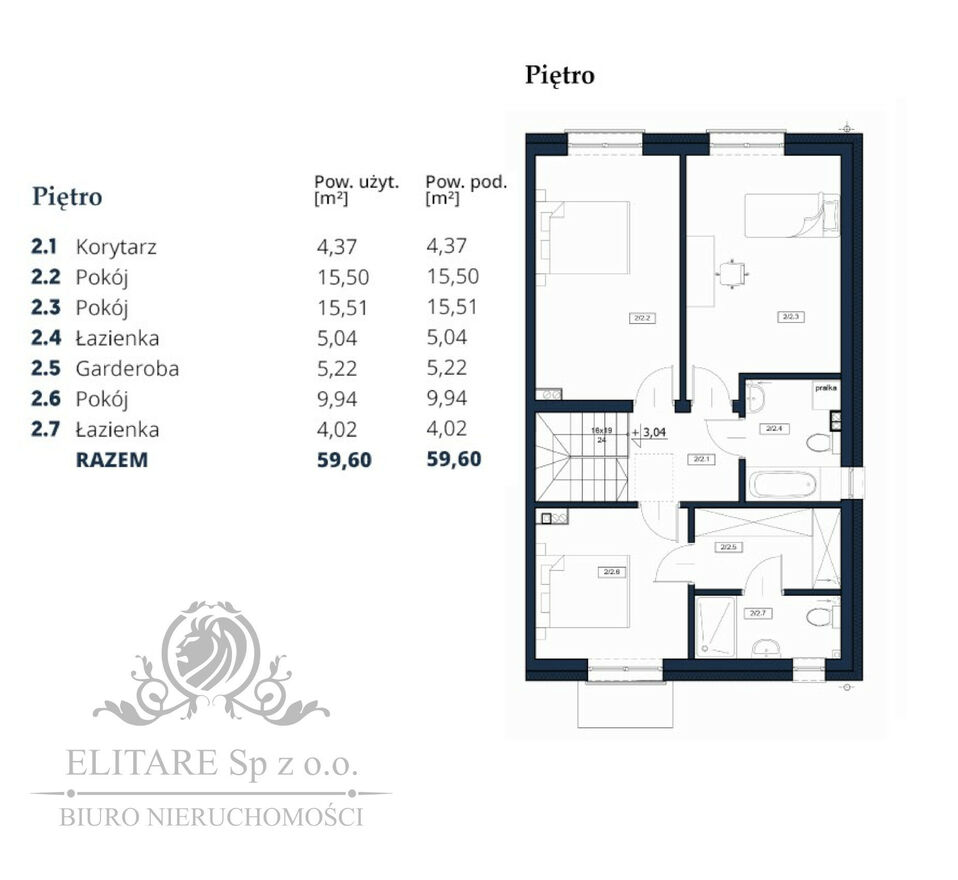 Dom ma klasyczny układ, dwupoziomowy ze strefa dzienną (61,77m2) na parterze oraz strefą nocną na piętrze (59,60m2) + opcjonalnie nieużytkowe poddasze (29,30m2):